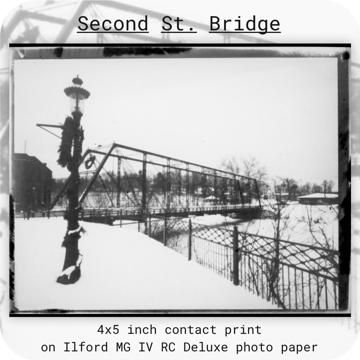 - Second St. Bridge - 4x5 inch contact print on Ilford Multigrade IV RC Deluxe paper. The Second Street Bridge is a one-lane, single-span truss bridge in Allegan, MI, spanning the Kalamazoo River that was built in 1886. It is a Michigan State Historic Site, a National Historic Civil Engineering Landmark, and is listed on the National Register of Historic Places.